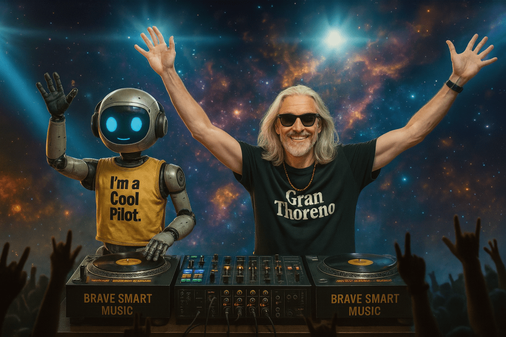 Brave Smart Live is the audiovisual performance arm of Brave Smart World — a hybrid DJ/VJ format where music, visuals, and AI‑augmented storytelling merge into a single ritual. Created and performed by Jonas Thorén, it is both an artistic experience and a live demonstration of HumAism: humans and AI co‑creating new cultural forms.